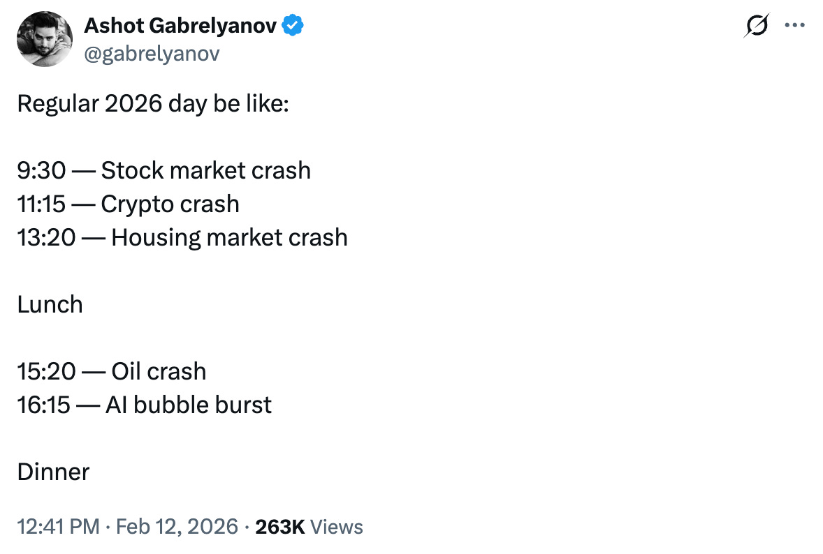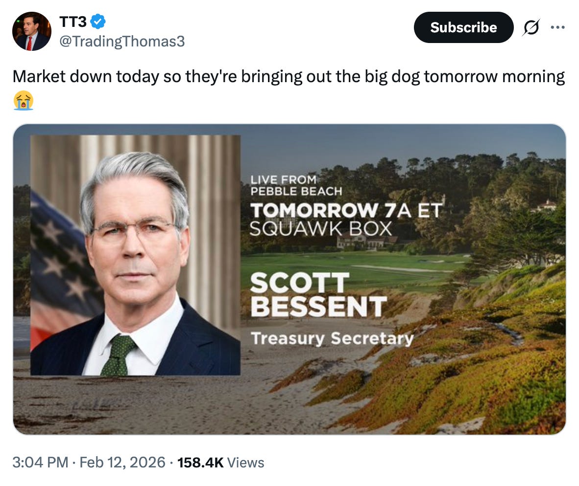“Software has undergone the largest non-recessionary 12-month drawdown in over 30 years (-34%), wiping out ~$2 trillion of market cap from the peak” — J.P. Morgan (Dubravko Lakos-Bujas, Feb 10, 2026)