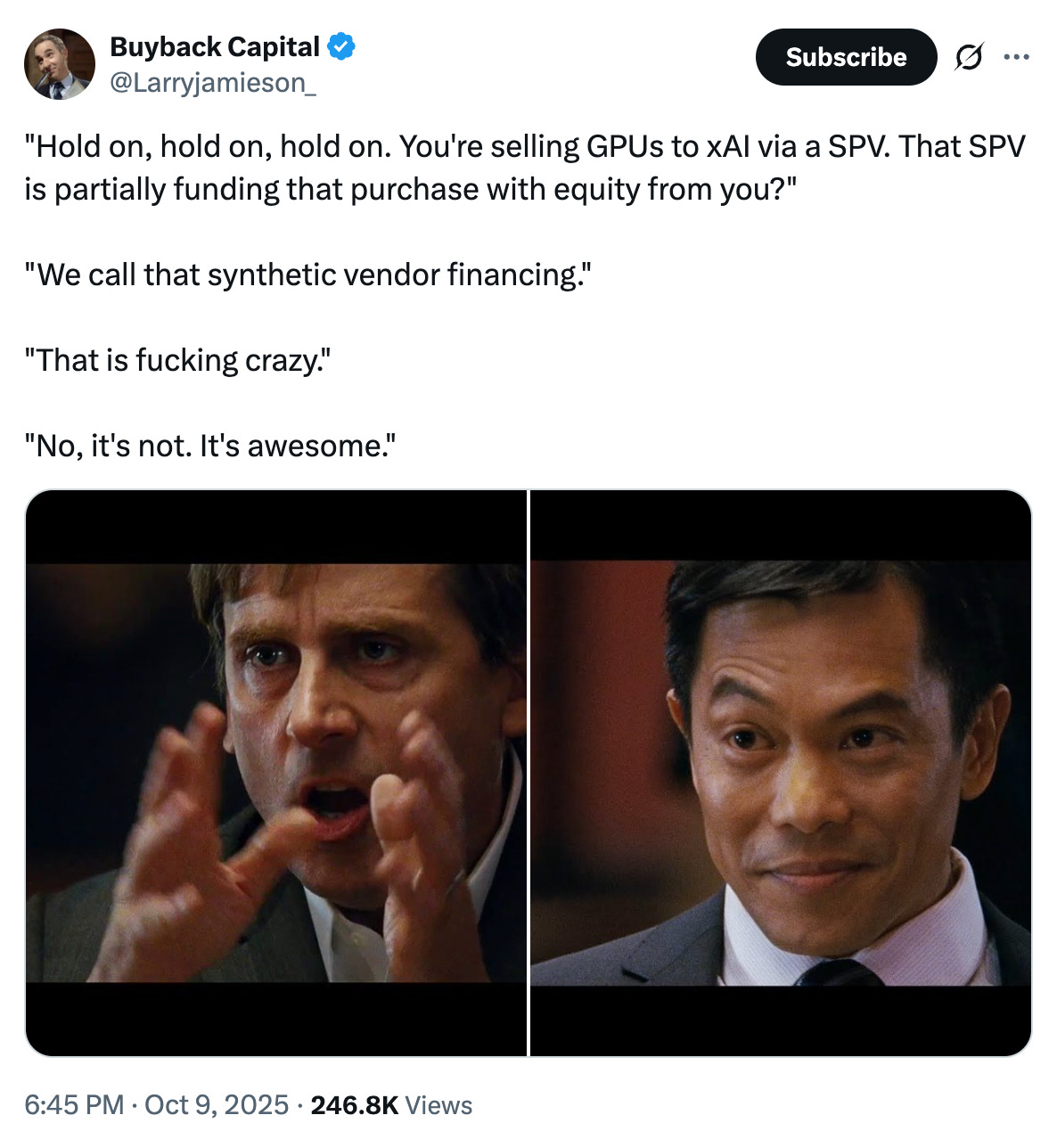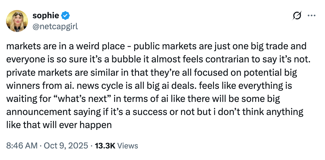 10 years on, we’re talking about another bubble. 2025 is a bit different because there’s a feeling that AI is holding up the entire economy, that a massive wave of debt is on the horizon, and that the consequences of getting this wrong wouldn’t just be a correction in asset prices, but a seriously destabilizing event.